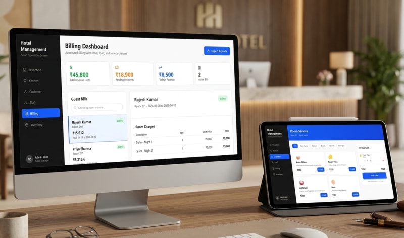 This system transforms your hotel into a fully connected ecosystem, allowing management, staff, and guests to interact seamlessly. Every process—from bookings and room service to kitchen coordination, billing, and reporting—is automated and centralized for maximum efficiency.